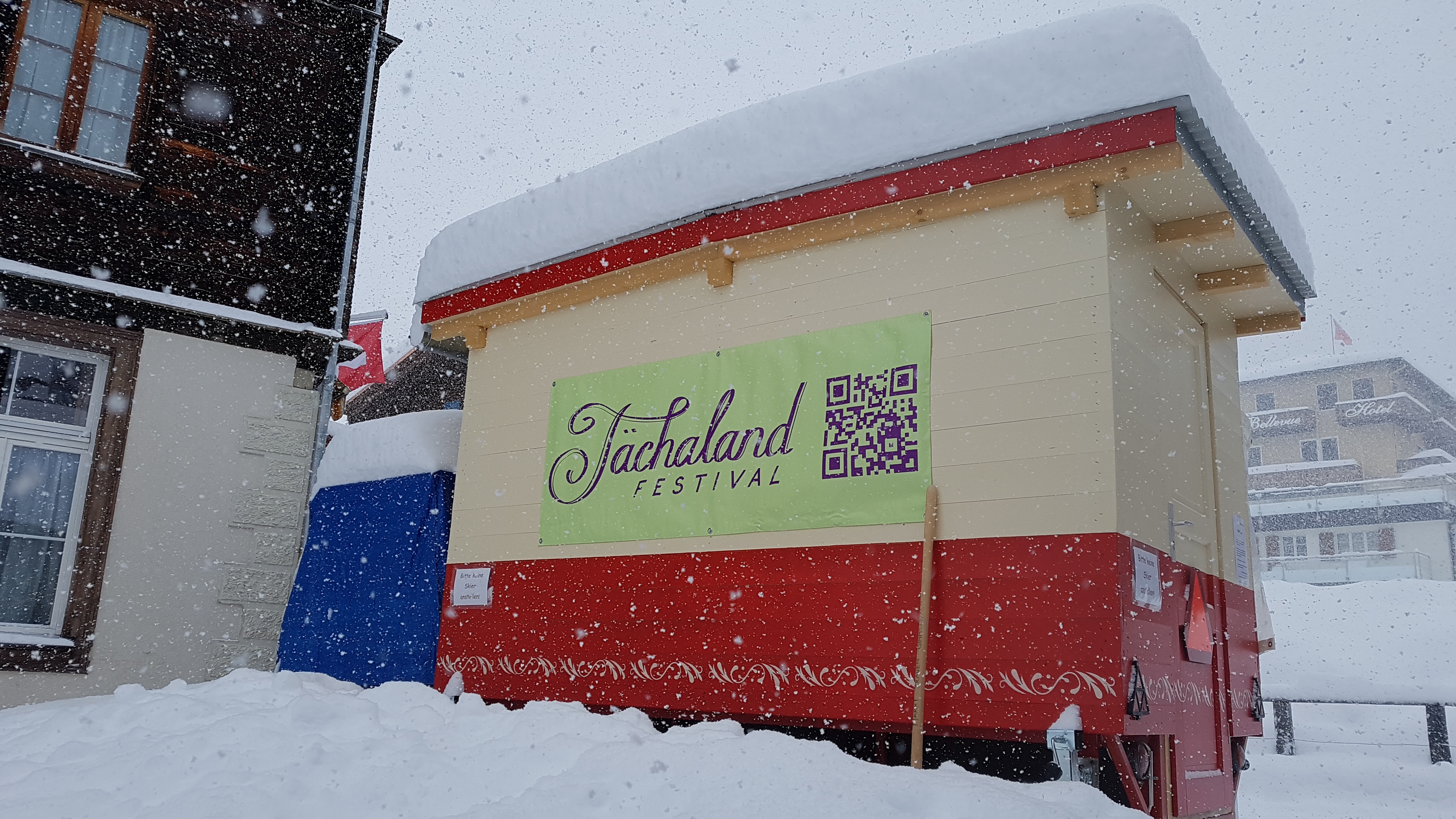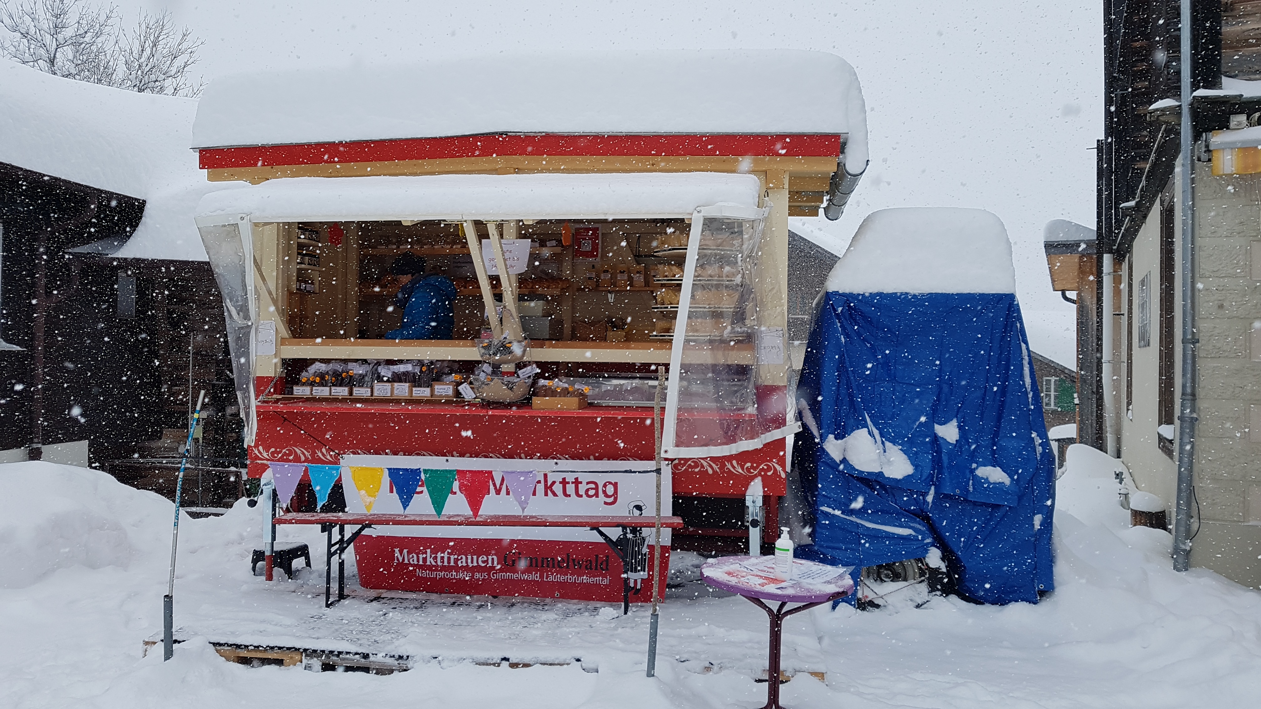 Der Marktwagen von Doris von Allmen steht in Mürren und ist geschmückt mit der ersten Tächaland Festival Werbeplache https://taechaland.ch/