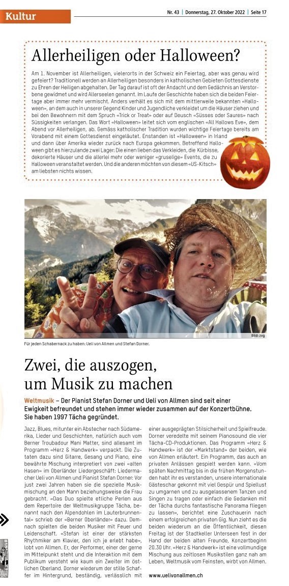Der Pianist Stefan Dorner und Ueli von Allmen sind ..." lebende Legenden" in der Berner Oberländer Musikszene. Sie haben 1997 zusammen Tächa gegründet.