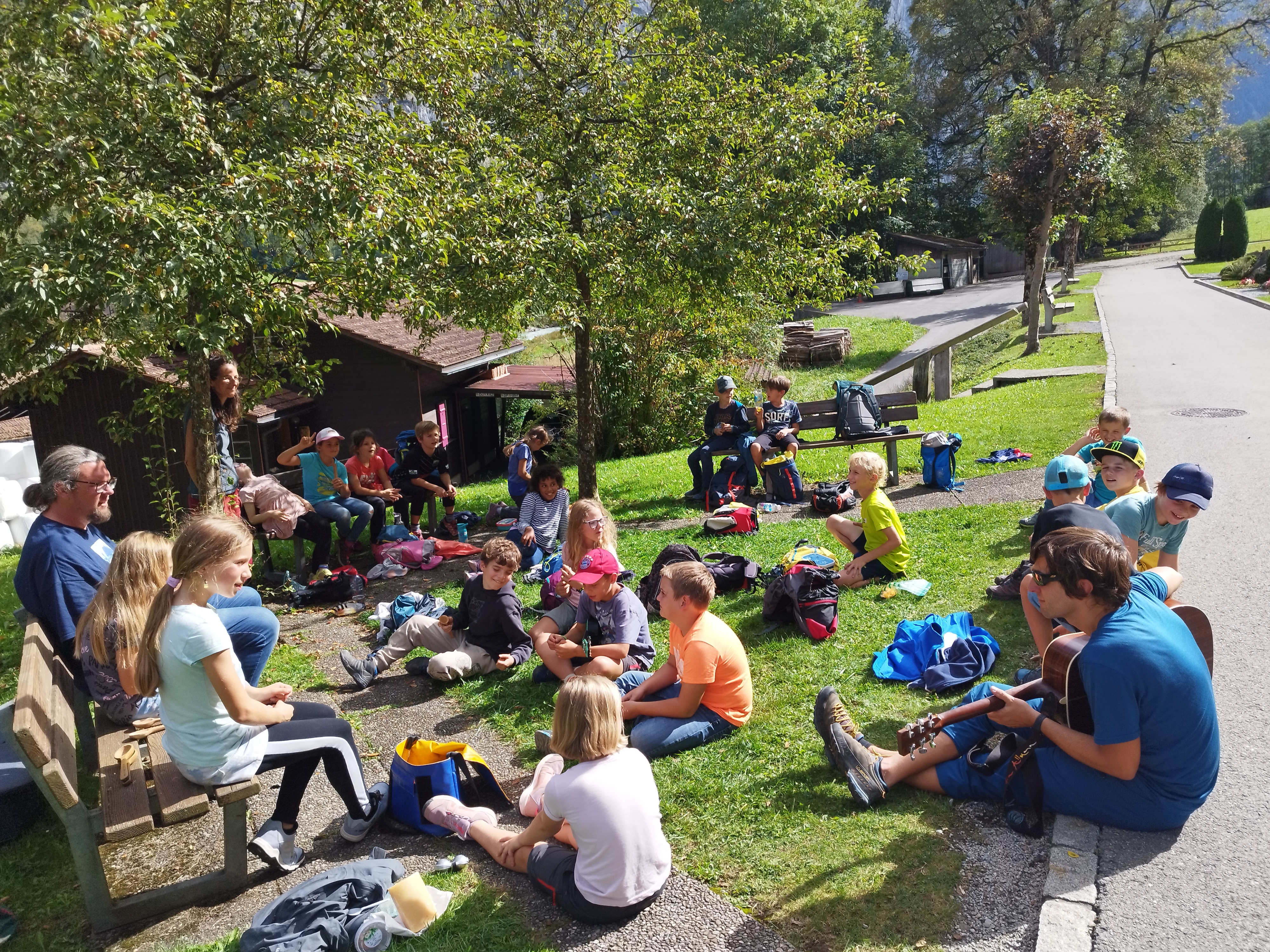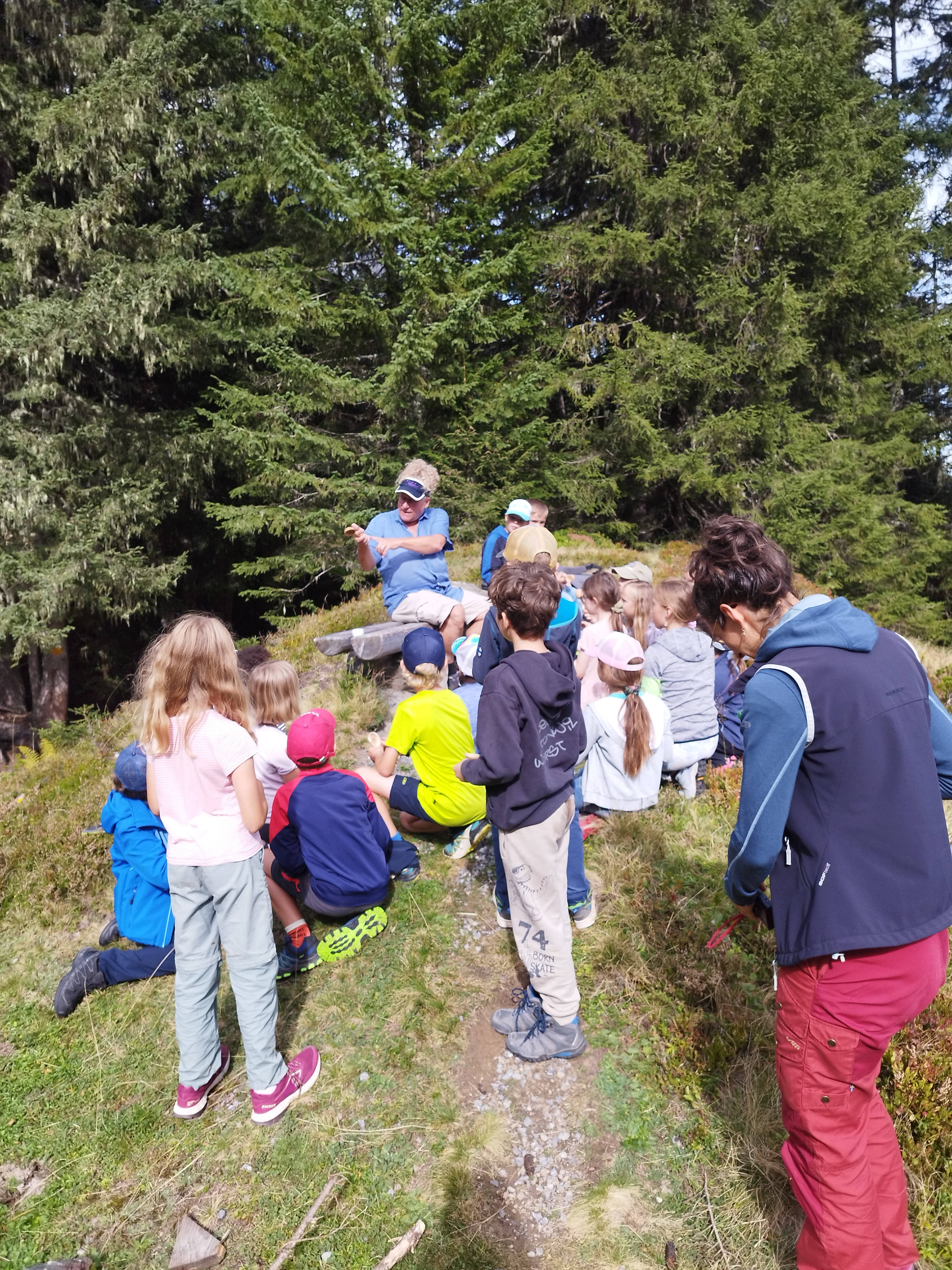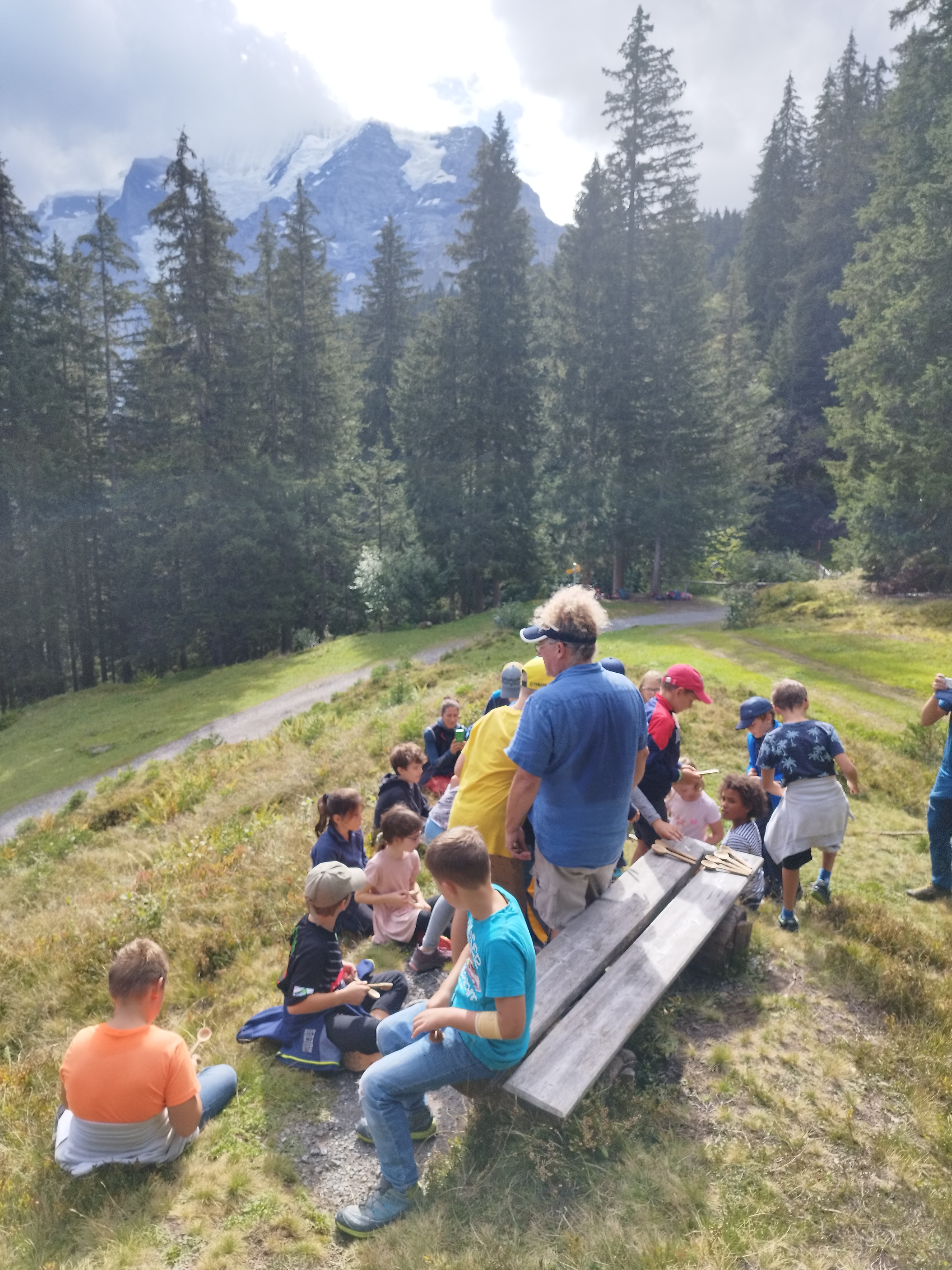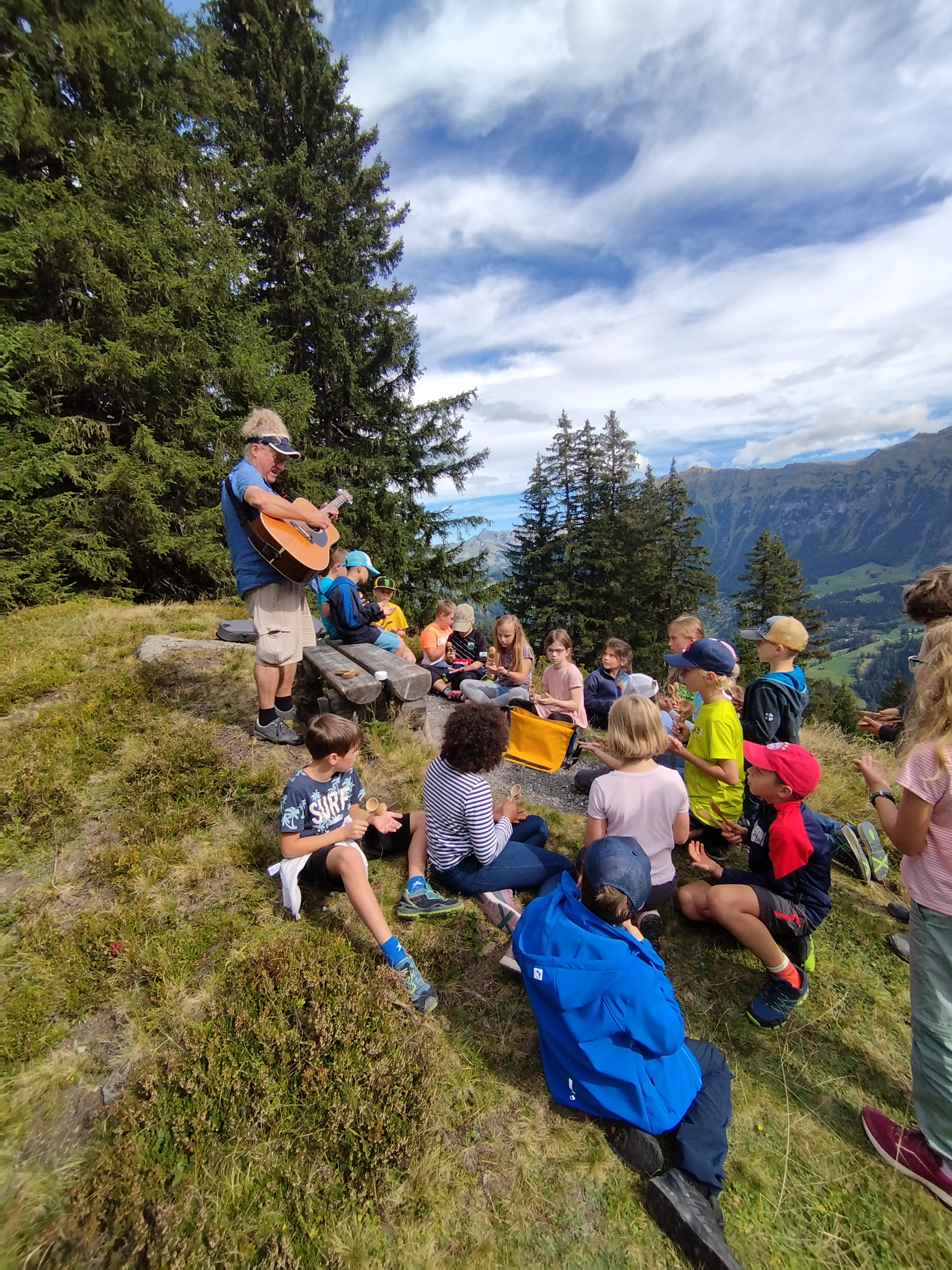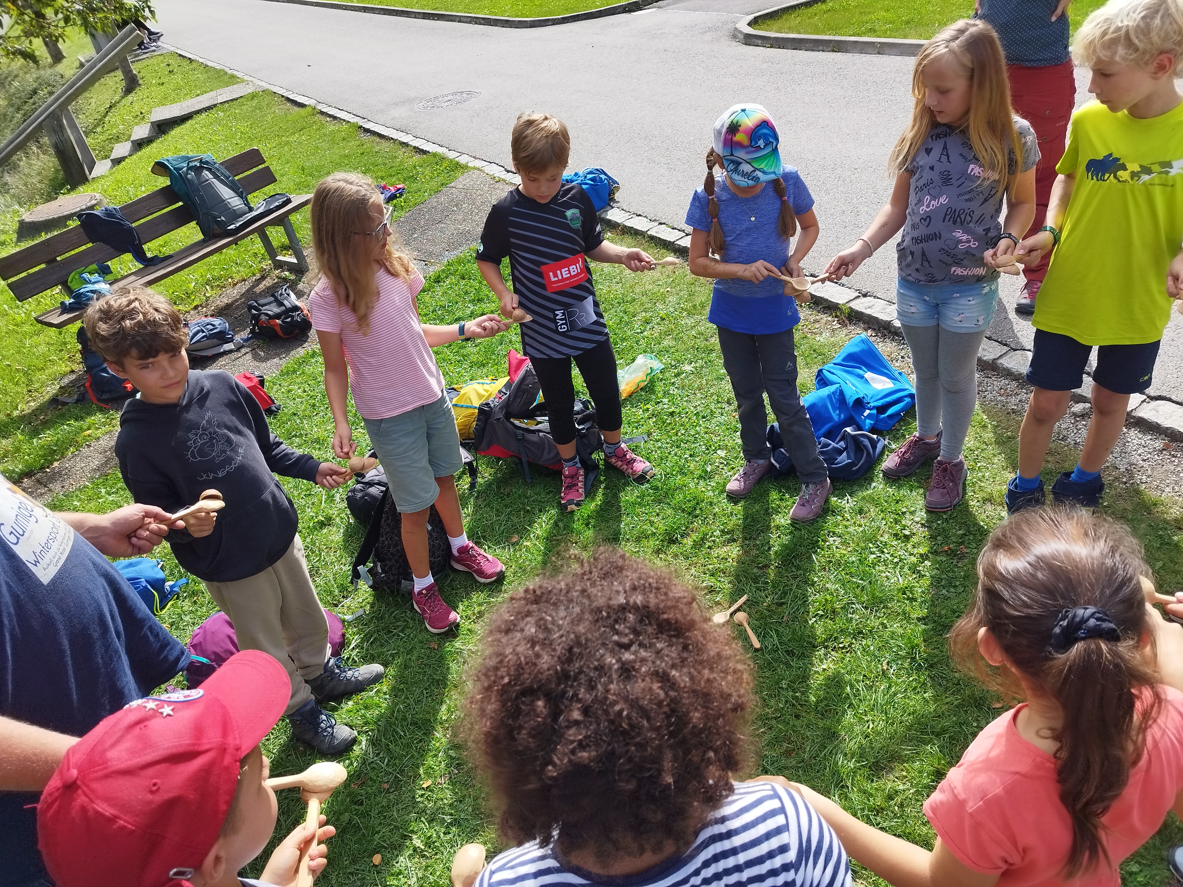Wir waren heute zusammen zu Fuss unterwegs von der Grütschalp nach Mürren. Eine singende Schulklasse mit ihrem musibegeisterten Lehrer und einer hilfsbereiten Mutter mit viel gute Laune und ausgezeichnetem Empfang. Janosch Hugi ist Bereichsleiter Bildungsangebote Unesco Welterbe Swiss Alps Jungfrau-Aletsch. Er hat unseren Ausflug im Tächaland Lauterbrunnental organisiert und sang mit den Kindern ein Bernerchanson. Eine Ukulele ging von Hand zu Hand. Dann packte ich im Wald meine Holzlöffel aus und wir verwandelten uns in eine Band.